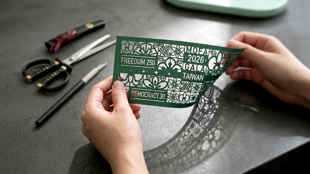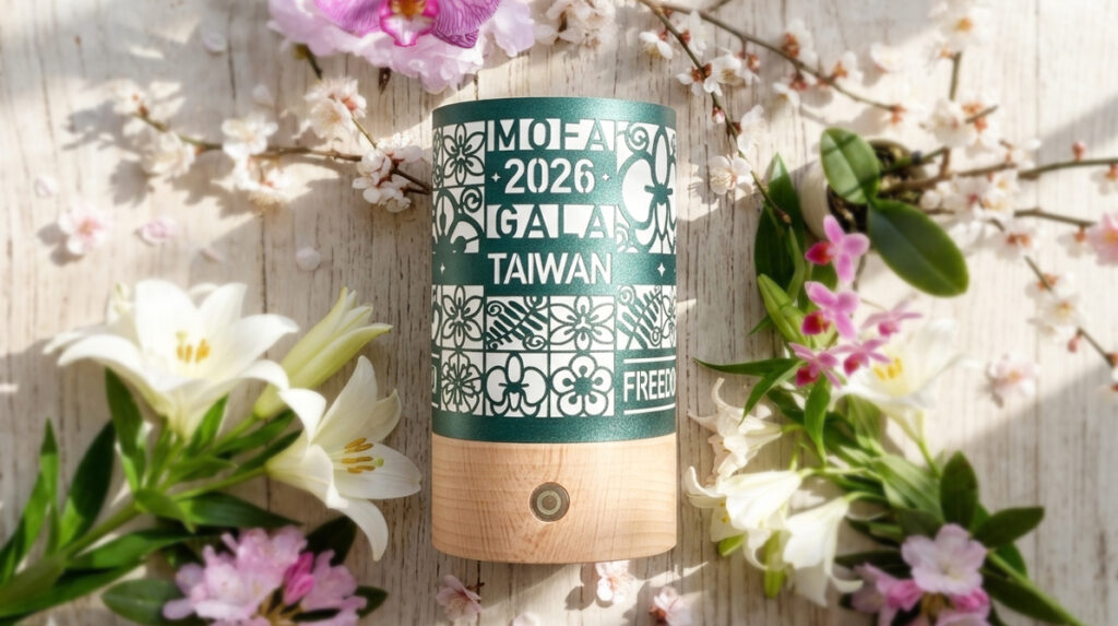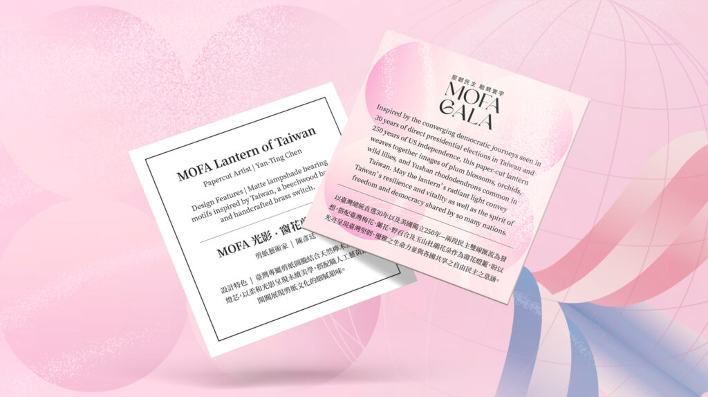 外交部春宴贈禮燈籠以臺灣總統直選30年及美國獨立250年 – 兩段民主雙線匯流為發想,搭配臺灣梅花、蘭花、野百合及玉山杜鵑花朵作為窗花燈籠之設計,盼以光亮呈現臺灣堅韌、優雅之生命力並與各國共享之自由民主之意涵。