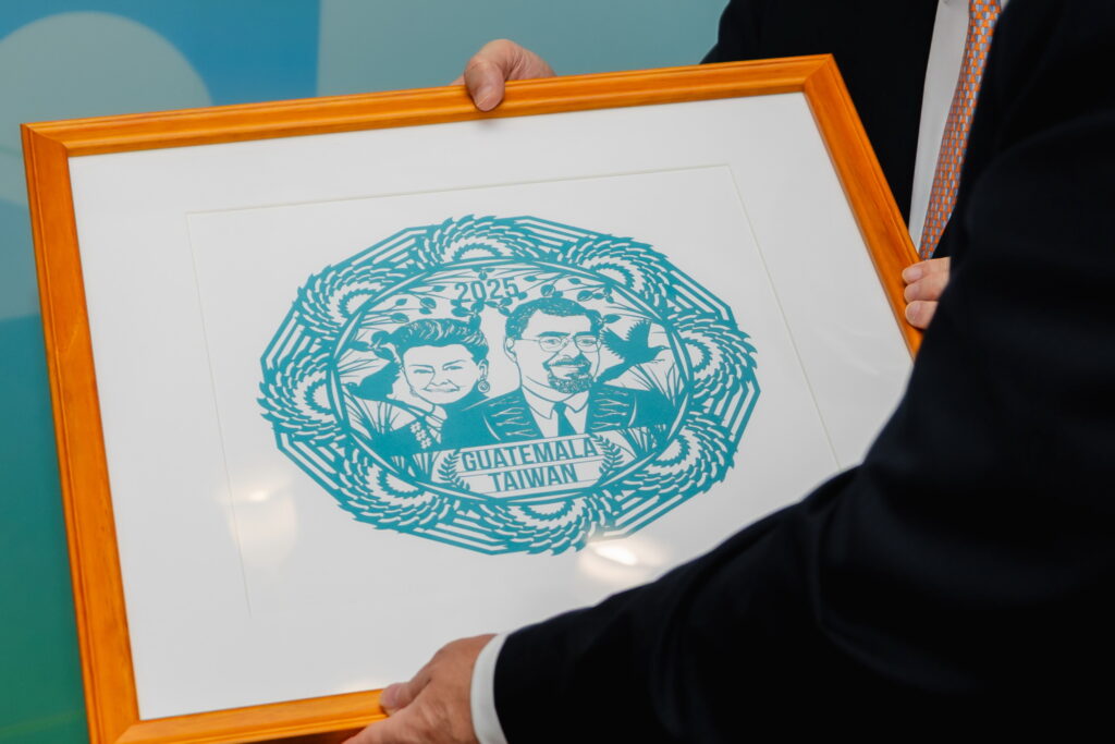 The year 2025 marks a significant milestone in the diplomatic relationship between Guatemala and Taiwan. This ceremonial paper-cutting artwork features laurel branches encircling the names of both nations, alongside the silhouettes of President Arévalo and First Lady Lucrecia Peinado, symbolizing the resilience, confidence, and shared aspirations of both peoples. The composition integrates a semiconductor wafer, representing Taiwan’s technological strength, and the giant kites of Guatemala, recognized by UNESCO as Intangible Cultural Heritage of Humanity, reflecting the fusion of innovation and tradition. Also depicted are the national birds of both countries—the resplendent quetzal of Guatemala and the Taiwan blue magpie—symbols of freedom and vitality. Together, these elements express the enduring friendship and firm commitment of Guatemala and Taiwan as they face global challenges hand in hand, striving toward a sustainable future.