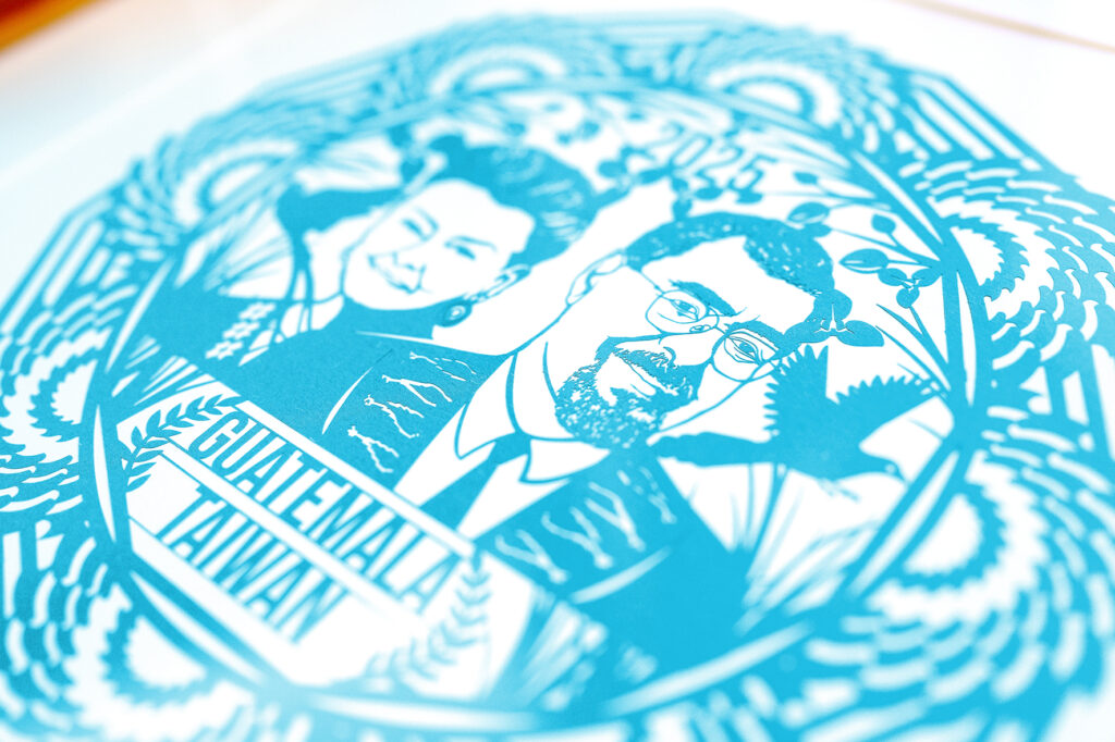 2025年是瓜地馬拉與台灣建交的重要里程碑。本次國禮剪紙作品以月桂樹環繞兩國國名,結合總統阿雷瓦洛與第一夫人貝娜多女士的剪影,象徵兩國人民堅韌、自信與對未來的共同期盼。作品融合代表台灣科技實力的半導體晶圓,及聯合國教科文組織認定的瓜地馬拉巨型風箏,展現科技與文化的交融。畫面中並納入象徵自由的國鳥—魁查爾與台灣藍鵲,傳遞雙方攜手迎向永續未來的深厚情誼與承諾。